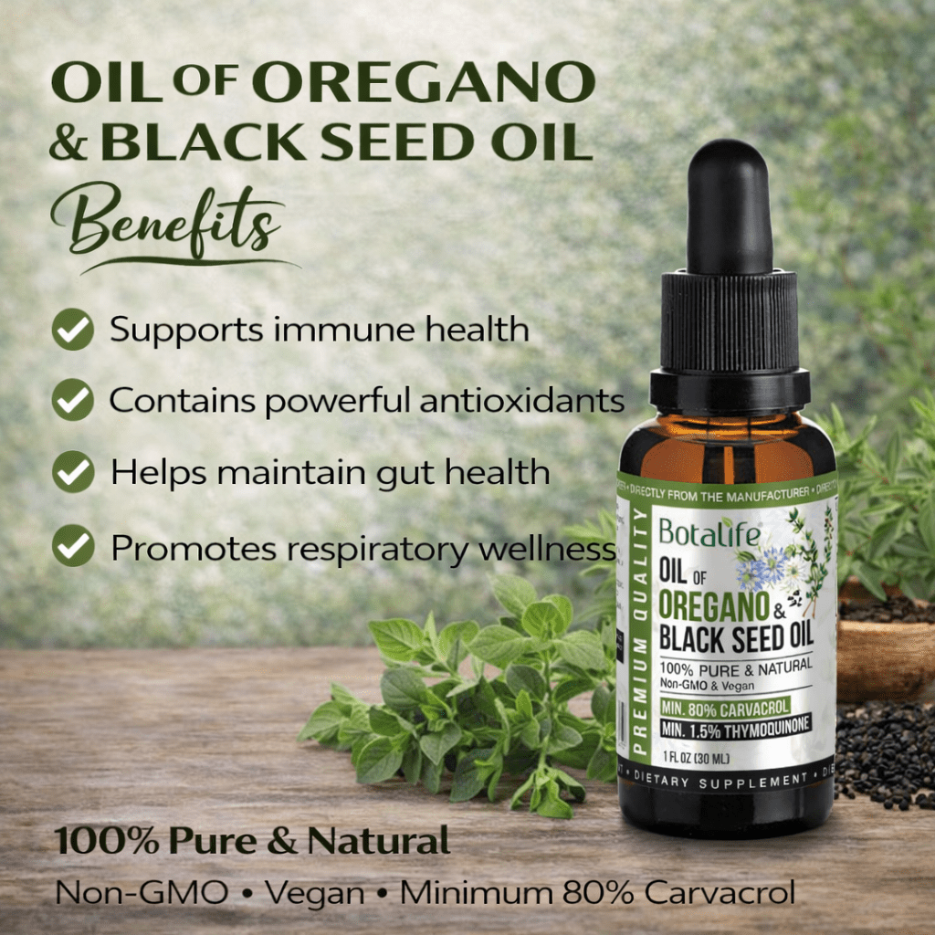 Botalife Oil of Oregano & Black Seed Oil combines two powerful natural extracts known for their wellness-supporting properties. Rich in carvacrol and thymoquinone, this potent formula helps support immune health, promotes gut balance, and provides antioxidant protection. Made from 100% pure, non-GMO, and vegan ingredients, it is carefully crafted to deliver maximum quality and effectiveness in every drop.